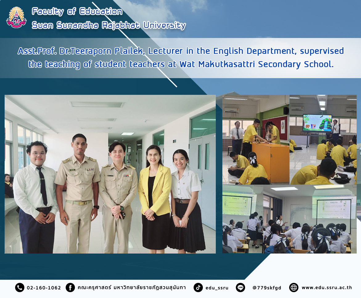 On August 4, 2025, Assistant Professor Dr.Teeraporn Plailek, Lecturer in the English Department, Faculty of Education, Suan Sunandha Rajabhat University, supervised the teaching of student teachers at Wat Makutkasatri Secondary School.
