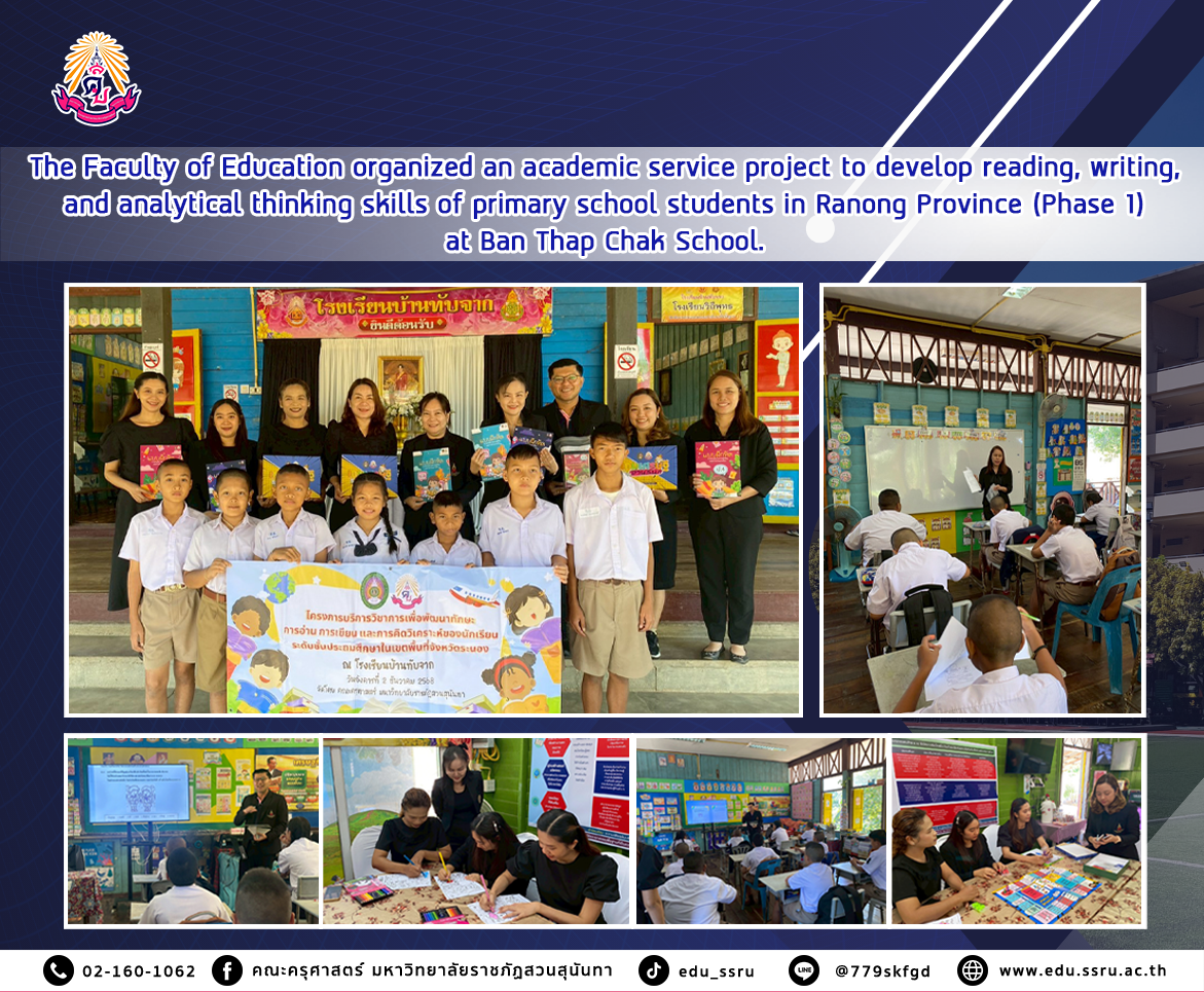 On December 2, 2025, the Faculty of Education, Suan Sunandha Rajabhat University, organized an academic service project to develop reading, writing, and analytical thinking skills for elementary school students, Phase 1, under the main project "Educational Quality Improvement and Educational Innovation Development Project based on the PTRU Competency-Based Model." The project aimed to promote basic language skills and develop analytical thinking for students in grades 4–6 at Ban Thap Chak School, Ranong Province, to enhance academic achievement and skills necessary for future learning.