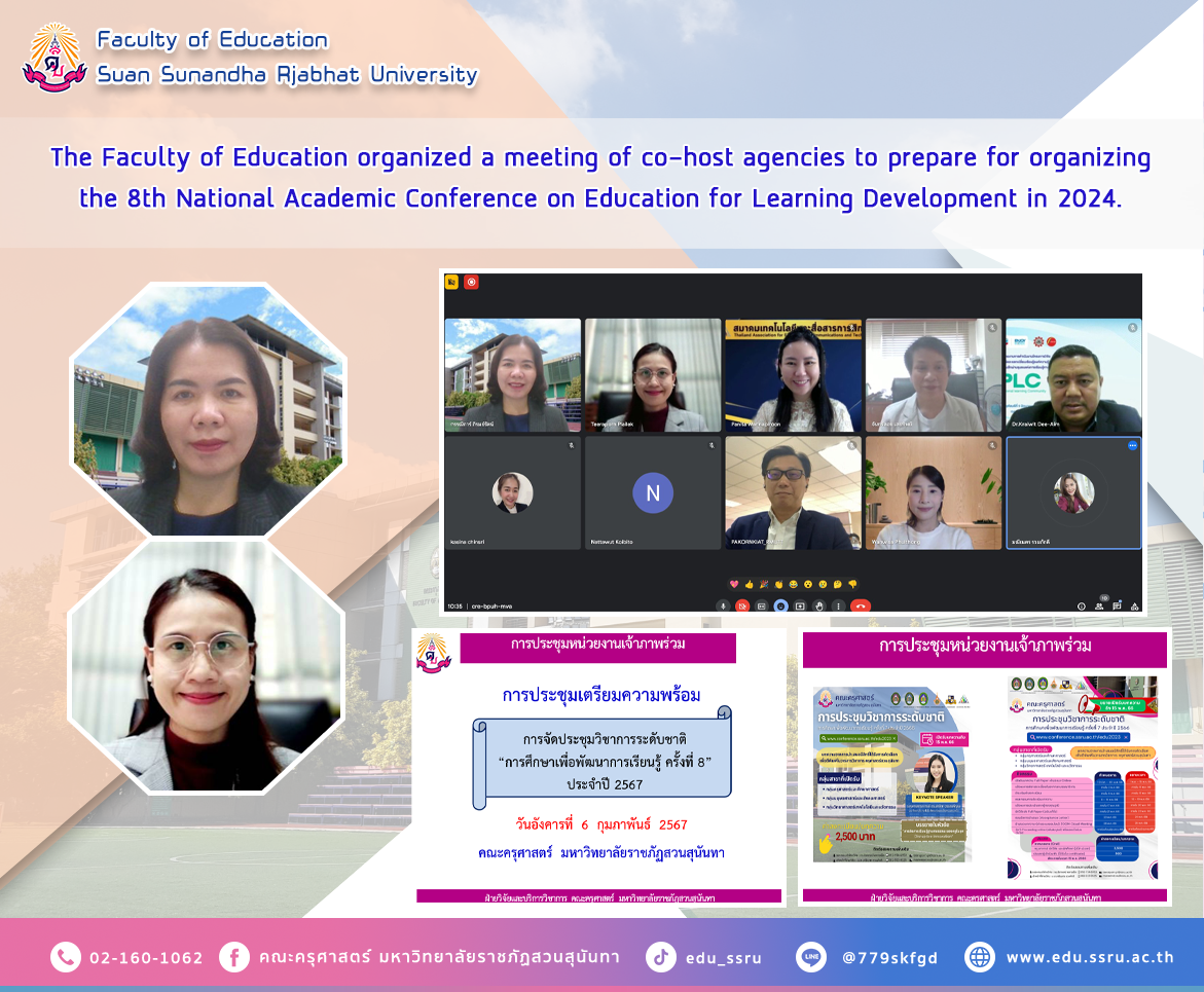 On February 6, 2024, the Faculty of Education, Suan Sunandha Rajabhat University, led by Assistant Professor Dr. Kannika Phiromrat, Dean of the Faculty of Education, along with Assistant Professor Dr.Teeraporn Plailek, Deputy Dean for Research and Academic Services, and Ms.Maneenet Ruamphakdee, Research and Academic Services Officer, organized a meeting of co-host agencies to prepare for organizing the 8th National Academic Conference on Education for Learning Development, year 2024, via an online system.