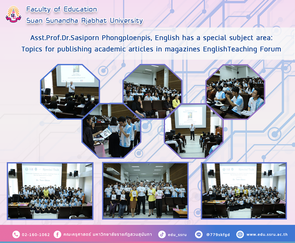 February 8, 2024, Assistant Professor Dr.Sasiporn Phongploenpis, Department of English, Faculty of Education, Suan Sunandha Rajabhat University Organized a special lecture topic: Guidelines for publishing academic articles in magazines EnglishTeaching Forum at Room 1137, Faculty of Education, Suan Sunandha Rajabhat University, by Dr. Tom Glass, Chief Editor. I was honored to be a lecturer on the said topic and successfully completed The organizer would like to thank you. Regional English Language Office (RELO), U.S. Embassy, for supporting academic writing learning activities for English teachers on this occasion.