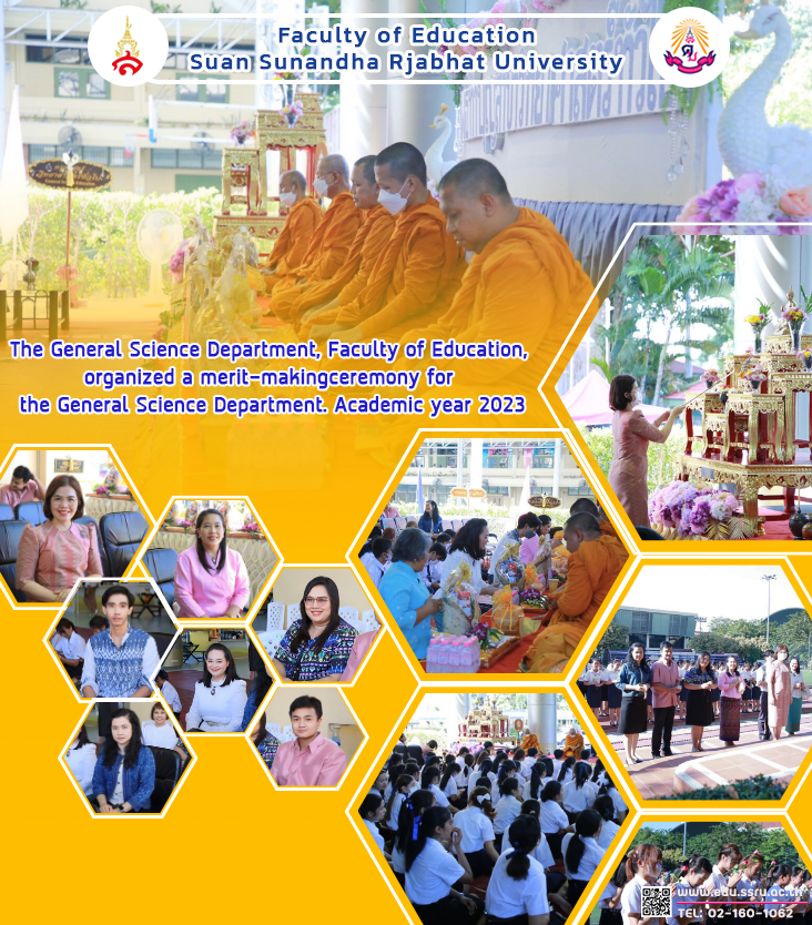 December 8, 2023, Department of General Science, Faculty of Education, Suan Sunandha Rajabhat University, led by Associate Professor Dr.Jetsada Rajniyom, Head of Department of General Science, along with teachers and students in the field of study Organize a merit-making ceremony in the field of general science. For the academic year 2023, friends are auspicious for teachers and students, with Assistant Professor Dr. Kannika Bhiromrat presiding over the lighting of incense sticks and candles for the Triple Gem, offering garlands, and offering offerings to monks. To 5 monks at the teacher's courtyard, Faculty of Education, Suan Sunandha Rajabhat University.