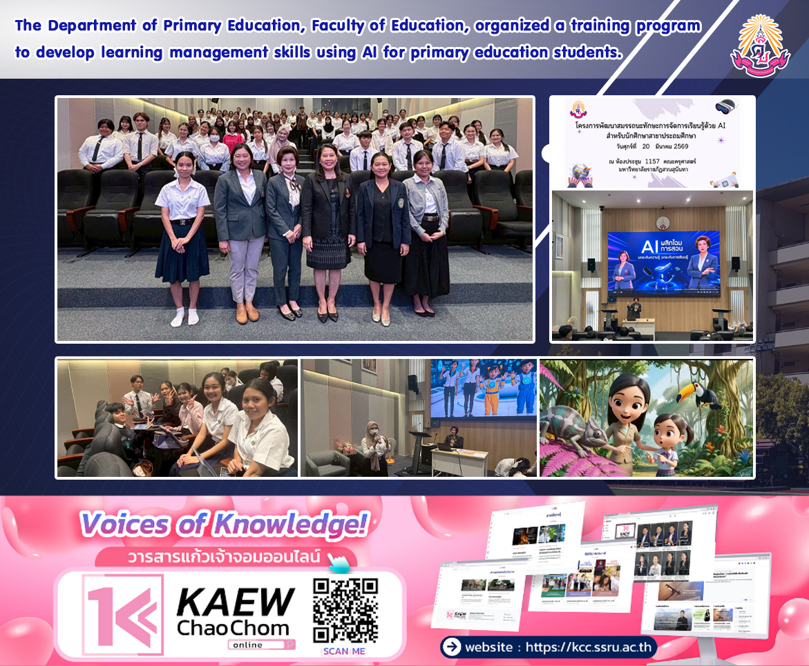 On March 20, 2026, from 8:30 AM to 4:30 PM, the Faculty of Education, Suan Sunandha Rajabhat University, led by Assistant Professor Dr.Boonrudee Udomphol, Deputy Dean for Planning and Quality Assurance, who officially opened the project, and Dr. Pattra Ountinkorn, who organized the project, along with expert speakers, Ms. Sirilak Lerthiransap and Ms. Butsirin Jiwpanich, participated in the project to develop AI-powered learning skills for primary education students. Sixty-nine first-year primary education students from the Faculty of Education attended the training. The activities included lectures and practical exercises on the topic of “Critical Thinking to Conquer AI,” aiming to enhance understanding of applying AI in teaching and designing innovative AI-powered learning materials for real-world classroom implementation. The objective of this project was to enable students to effectively apply their knowledge of creating innovative AI-powered learning materials in their teaching careers, aligning with 21st-century learning.