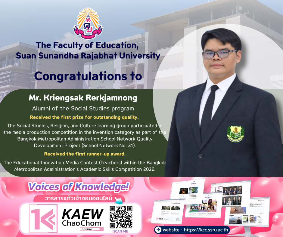 The Faculty of Education, Suan Sunandha Rajabhat University, congratulates Mr. Kriengsak Rerkjamnong, an alumnus of the Social Studies program, on receiving the Outstanding Quality Award in the Social Studies, Religion, and Culture learning area in the Media Production Competition (Invention Category) of the Bangkok Metropolitan Administration School Network Quality Development Project (School Network No. 31). He also received the first runner-up award in the Educational Innovation Media Competition (Teachers) at the Bangkok Metropolitan Administration Academic Skills Competition 2026.