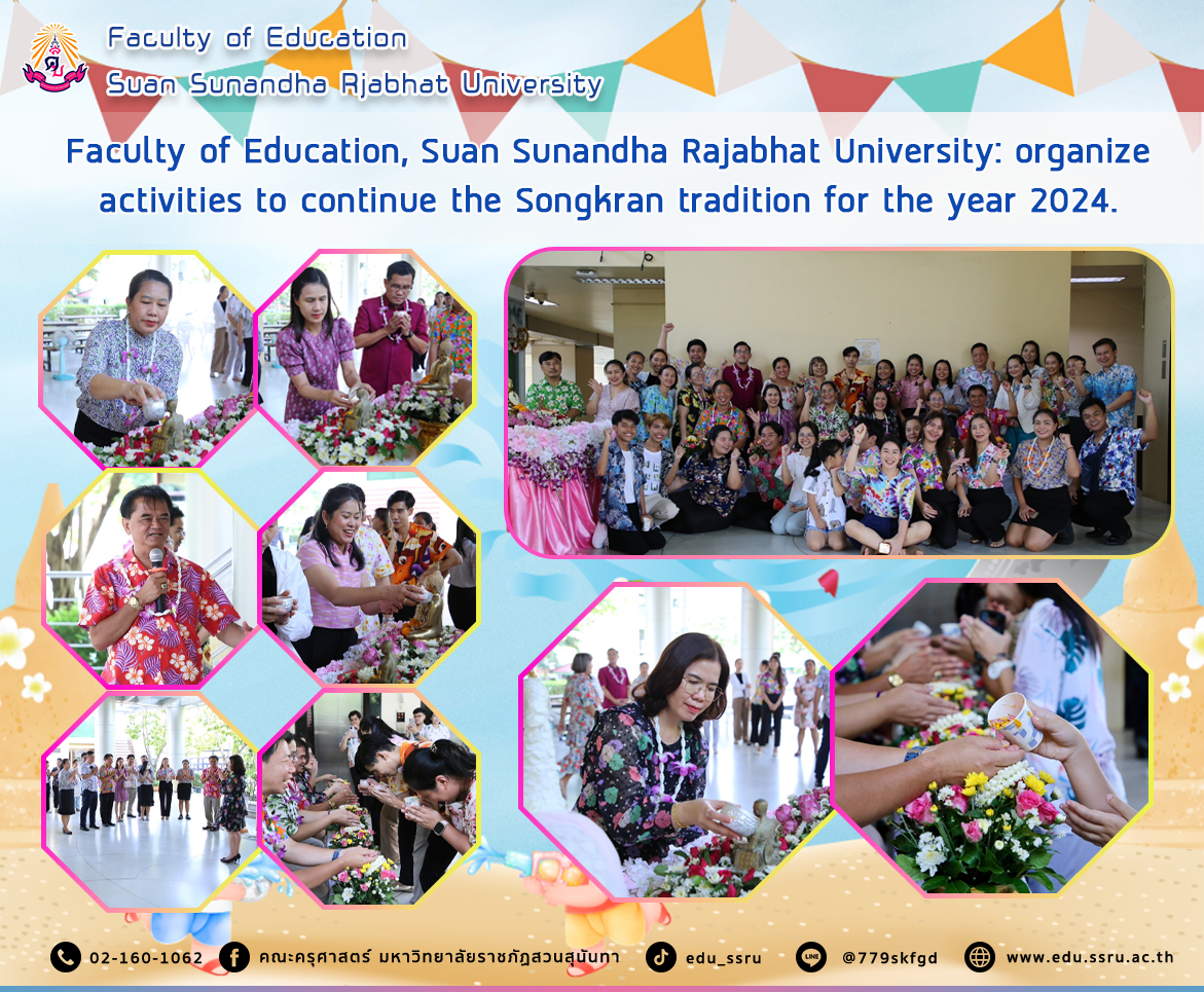 On April 9, 2024, the Faculty of Education, Suan Sunandha Rajabhat University, led by Assistant Professor Dr. Kannika Bhiromrat, Dean, administrators, teachers, personnel, and students, organized the activity of bathing the Buddha image and the statue of Queen Sunandha Kumariratana at the Teacher's House Plaza. For good fortune during the Songkran Festival and Thai New Year