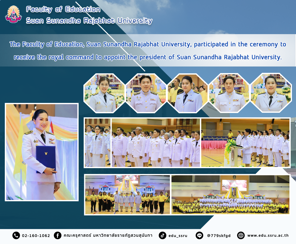 On April 1, 2025, at 8:30 a.m., the Faculty of Education, Suan Sunandha Rajabhat University, led by Assistant Professor Dr. Kannika Phiromrat, Dean of the Faculty of Education, along with the executives and personnel of the Faculty, participated in the ceremony to accept the royal command to appoint "Associate Professor Dr. Chutikarn Sriviboon" to the position of President of Suan Sunandha Rajabhat University at the Suan Sunandha Health and Sports Center Building, 4th floor, Suan Sunandha Rajabhat University.