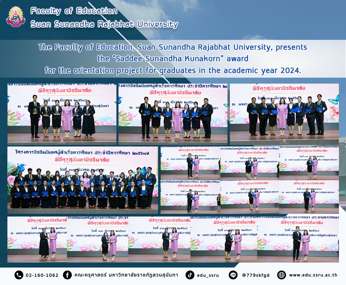 On March 31, 2025, from 4:00 to 5:00 p.m., the Faculty of Education, Suan Sunandha Rajabhat University, presented the “Praise to Sunandha Kunakorn” award, an orientation project for graduates of the academic year 2024, with Assistant Professor Dr. Kannika Phiromrat, Dean of the Faculty of Education, presenting the award at the Sunantha Anusorn Auditorium, Suan Sunandha Rajabhat University.