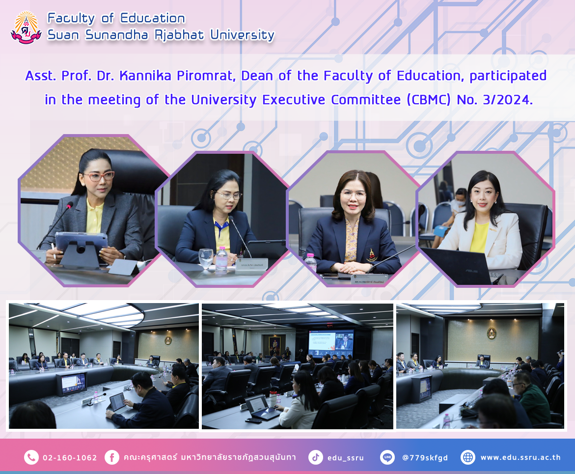 On March 11, 2024, from 8:30 a.m. to 12:00 p.m., Assistant Professor Dr. Kannika Piromrat, Dean of the Faculty of Education, and Associate Professor Dr.Sumalee Tientongdee, Assistant Rector for Academic Affairs at Suan Sunandha Rajabhat University I participated in the Suan Sunandha Rajabhat University Executive Committee meeting No. 3/2024 with Associate Professor Dr. Chutikarn Sriwiboon, President of Suan Sunandha Rajabhat University. I chaired the meeting at the University Council meeting room, Building 31, 5th floor, and via the Google Meet online system.