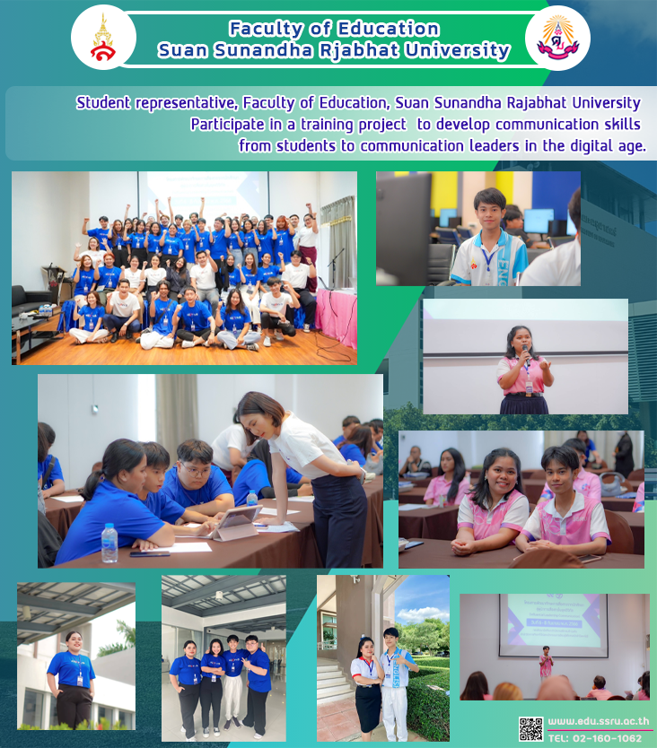 On September 6–8, 2023, student representatives from the Faculty of Education, Mr. Kamchai Prasong, a 2nd year student with an English major, and Ms. Nattarika Champromrat, a 2nd year student in the field of social studies, Participate in a training project to develop communication skills from students to leaders in the digital age (Influential Leadership Communication) to lay out guidelines for developing student leaders to have knowledgeable leadership qualities and professional public speaking skills. Have a positive perspective or attitude. Plan and design creative learning activities using information technology. Build personality and make student leaders have the courage to think and express themselves. To prepare for teamwork and new ideas. In organizing student leadership development activities organized by the Student Development Division In collaboration with the School of General Education and Electronic Learning Innovation at Kaew Chao Chom Hotel, Suan Sunandha Rajabhat University Nakhon Pathom Campus