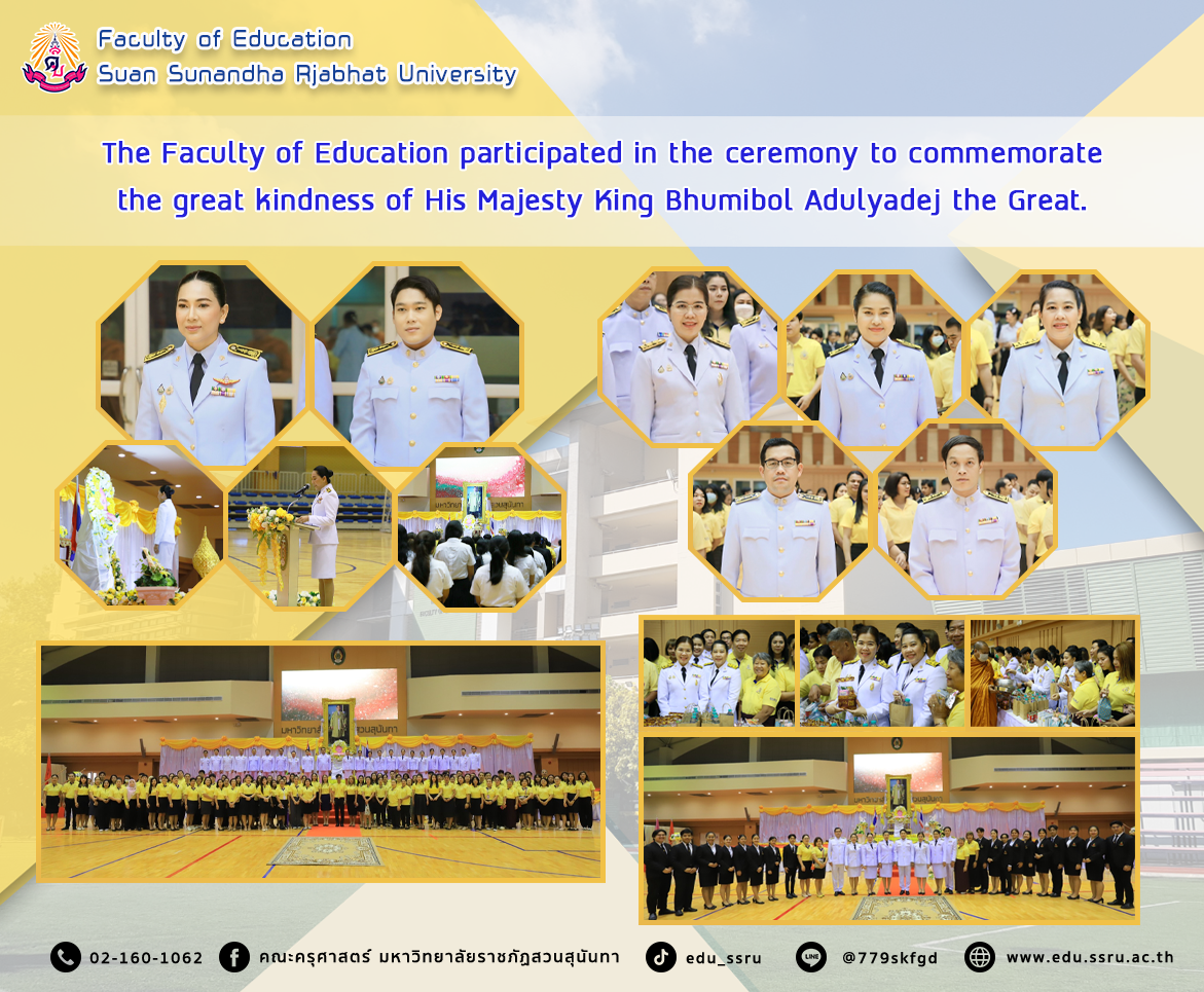 On October 11, 2024, the Faculty of Education, Suan Sunandha Rajabhat University, led by Assistant Professor Dr. Kannika Phiromrat, Dean of the Faculty of Education, Assistant Professor Dr. Boonrudee Udomphol, Deputy Dean for Planning and Quality Assurance, Assistant Professor Tasanee Setthapong, Deputy Dean for Academic Affairs, Mr. Wiraphon Rattanawar, Deputy Dean for Administration, Assistant Professor Phanuwat Siwasakulrat, Deputy Dean for Student Affairs and faculty personnel, participated in the ceremony to commemorate the great kindness of "King Bhumibol Adulyadej the Great", chaired by Associate Professor Dr. Chutikan Srivibul, President, along with executives, personnel, students, and students attending the ceremony at the Health and Sports Center Building, 4th floor.