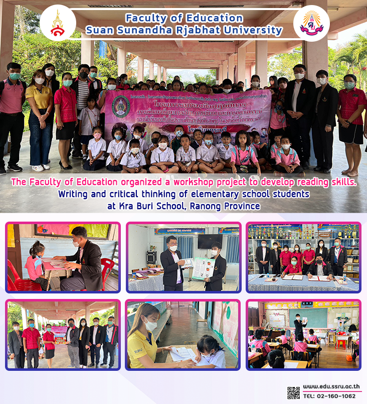 On January 11, 2023, the Faculty of Education at Suan Sunandha Rajabhat University was led by Dr. Teeraporn Plailek, Associate Dean for Research and Academic Services, and faculty members. Organize a workshop project to develop reading, writing, and critical thinking skills. of OBEC elementary school students in the area of Ranong Province at Kraburi School, Ranong Province