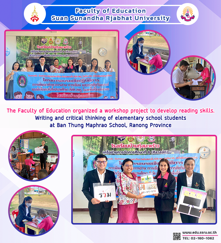 On January 11, 2023, the Faculty of Education at Suan Sunandha Rajabhat University was led by Dr. Teeraporn Plailek, Associate Dean for Research and Academic Services, and faculty members. Organize a workshop project to develop reading, writing, and critical thinking skills. of OBEC elementary school students in Ranong province at Ban Thung Maphrao School, Ranong Province