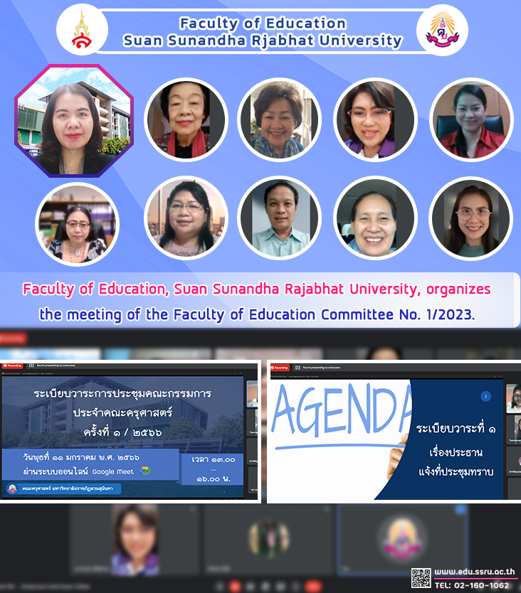 On January 11, 2023, from 1:00 p.m. to 4:00 p.m., the Faculty of Education at Suan Sunandha Rajabhat University organized the 1/2023 Committee Meeting of the Faculty of Education, led by Assistant Professor Dr. Kannika Piromrat, Dean of the Faculty of Education, along with the Faculty's committee and secretary, and was honored by Associate Professor Dr. Jiraporn Siritawee, Assistant Professor Dr. Tuenjai Thongsamrit, and Mrs. Saithong Trisattayakul, who are experts. via online system Google Meet