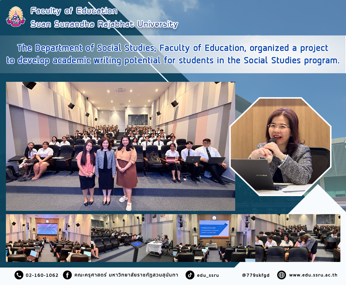 On February 8, 2025, the Social Studies Program, Faculty of Education, Suan Sunandha Rajabhat University, organized a project to develop academic writing potential for students in the Social Studies Program, a practical training activity on the topic of practical research article study techniques in the classroom at Room 1137.