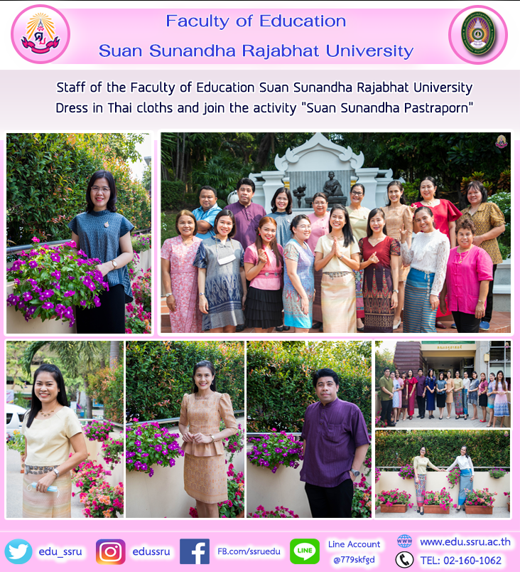 March 12, 2021 Assistant Professor Dr. Kannika Piromrat, Dean of Education Along with staff of the Faculty of Education Dress up in Thai cloths and join the activity "Suan Sunandha Pastraporn" to promote Thai identity.