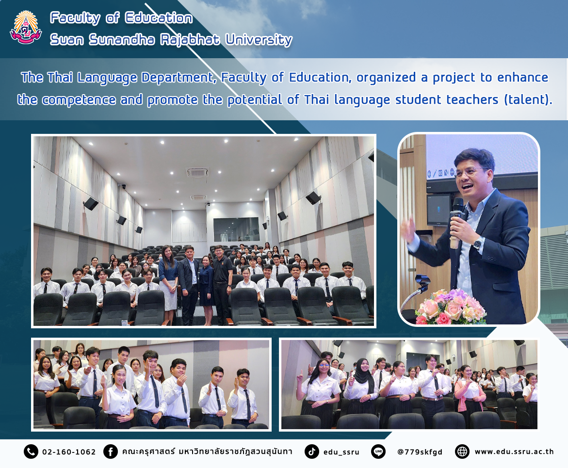 On March 11, 2025, the Faculty of Education, Suan Sunandha Rajabhat University, led by Lecturer Thidadow Dechsri and Lecturer Benjaporn Praisorn, lecturers of the Thai Language Program, organized a project to build competence and promote the potential of Thai Language student teachers (talent) on the topic of "Preparing for the Stage: Professional Speech Techniques" for Thai Language Program students, with Lecturer Phrommin Prapaiphong as a speaker.