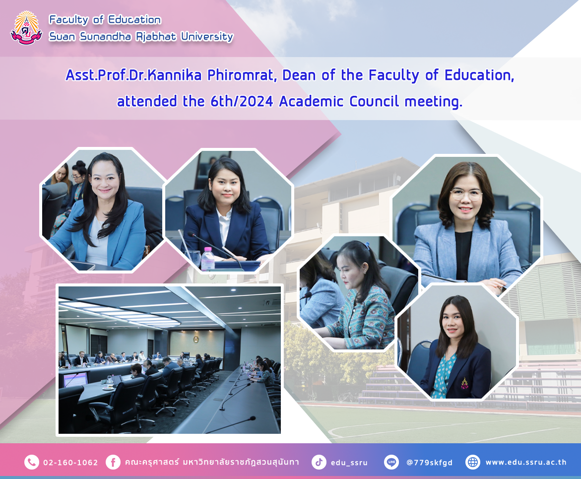 On June 12, 2024 at 9:00 a.m., Assistant Professor Dr. Kannika Phiromrat, Dean of the Faculty of Education, Lecturer Dr. Patcharaporn Philasombat, Chair of the Graduate Diploma in Teaching Program, and Mrs.Sararat Phemyad, General Administration Officer (Administrative Work), attended the 6/2024 Academic Council Meeting, chaired by Associate Professor Dr. Chutikarn Sriwiboon, President of Suan Sunandha Rajabhat University, at the University Council Meeting Room, 5th Floor, Building 31, Suan Sunandha Rajabhat University.