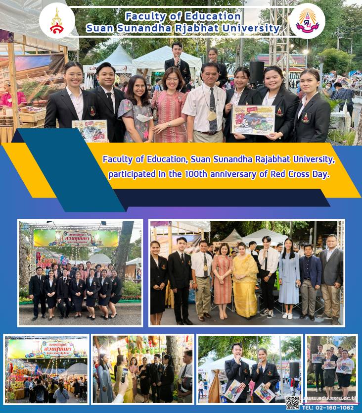 On December 8, 2023, the Faculty of Education at Suan Sunandha Rajabhat University, led by Assistant Professor Dr. Kannika Piromrat, Dean of the Faculty of Education, Assistant Professor Songkran Khuntiptong, Deputy Dean for Student Affairs Faculty personnel and students attended the 100th anniversary of the Red Cross Day under the concept of "Rejoicing in Sukruedee at the Place of Giving." By this year, the Office of Property and Income Bring troops to the event to sell many food and beverage products. There is also beautiful live music from students. Faculty of Fine and Applied Arts to listen and can join in making merit with the Thai Red Cross Society lottery. For a chance to win the grand prize of a BYD electric car at Zone 4 4.10 Suan Sunandha Rajabhat University at Lumpini Park, Pathumwan District, Bangkok.