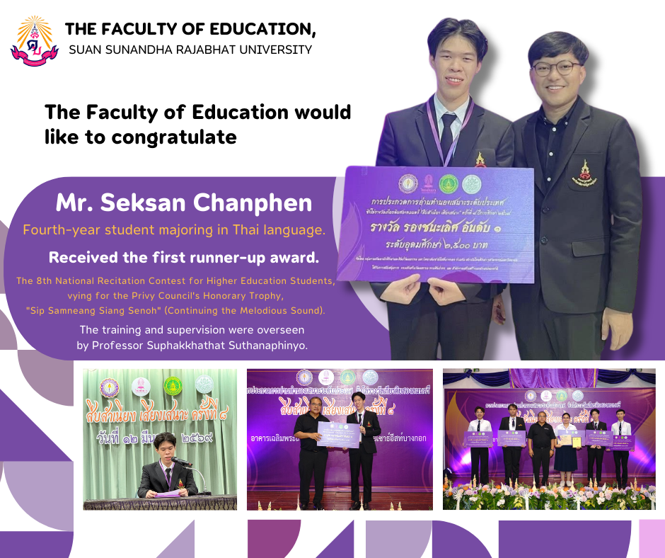 The Faculty of Education, Suan Sunandha Rajabhat University, congratulates Mr. Seksan Chanphen, a fourth-year student in the Thai Language program, on winning first runner-up in the 8th National Recitation Contest for Higher Education Students. The contest, for the Privy Council's Honorary Trophy, was organized by the Student Development and Arts and Culture Division of Southeast Bangkok University, in collaboration with the Thai Studies Institute, Chulalongkorn University, the Department of Cultural Promotion, the Fine Arts Department, and the Office of National Identity Promotion. The event took place at the 60th Anniversary Commemoration Building, Southeast Bangkok University, Bangkok. Professor Suphakkhathat Suthanaphinyo coached and supervised