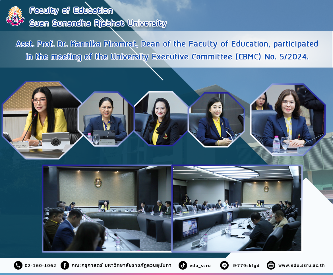 May 13, 2024, 8:30 a.m.–12:00 p.m., Assistant Professor Dr. Kannika Piromrat, Dean of the Faculty of Education, Suan Sunandha Rajabhat University I participated in the Suan Sunandha Rajabhat University Executive Committee meeting No. 5/2024 with Associate Professor Dr. Chutikarn Sriwiboon, President of Suan Sunandha Rajabhat University. I chaired the meeting at the University Council meeting room, Building 31, 5th floor.