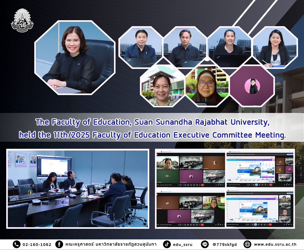 On November 12, 2025, the Faculty of Education, Suan Sunandha Rajabhat University, led by Assistant Professor Dr. Kannika Phiromrat, Dean, along with all Deputy Deans, Assistant Professor Suphanwadi Waiyarup, Director of the Early Childhood Development Center, and Lecturer Dr. Patcharaporn Philasombat, Director of the Educational Professional Development Center, held the 11th/2025 Faculty of Education Executive Committee Meeting in Meeting Room 1124 and online.