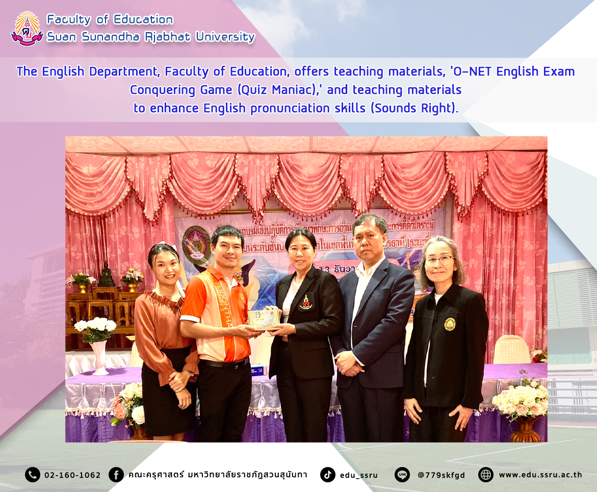 On December 12, 2024, Assistant Professor Dr.Sasiporn Phongploenpis, Lecturer of the English Program, Faculty of Education, Suan Sunandha Rajabhat University, presented the teaching materials ‘O-NET English Quiz Maniac’ and the teaching materials to enhance English pronunciation skills (Sounds Right), patent number 24640, to teachers of the Foreign Languages group at Ban Sri Muang School. In addition, Asst. Prof. Dr. Tharasanan Unnanant, Head of the English Program, and Assistant Professor Dr. Duangkamol Thitiwet discussed the project and future academic cooperation.