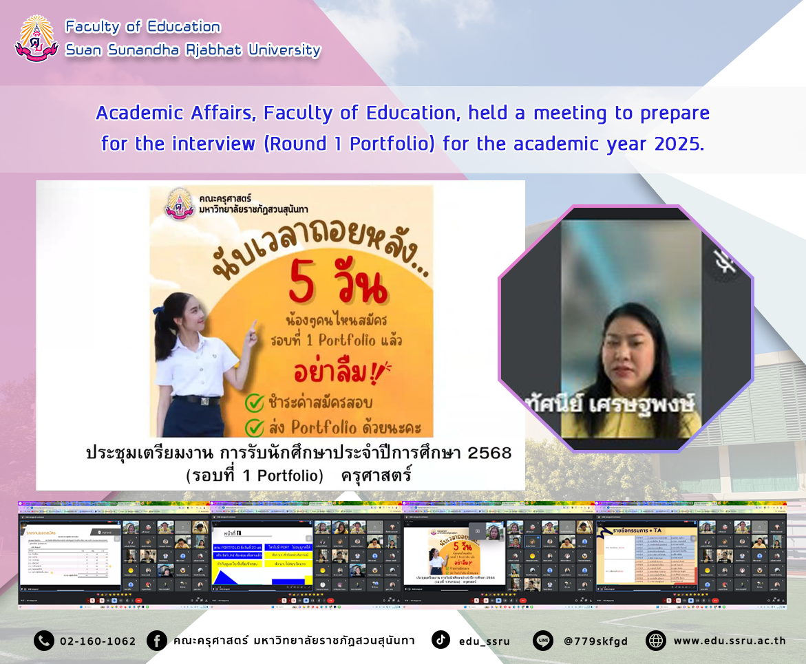 On January 13, 2025, led by Assistant Professor Dr.Tasanee Satthaphong, Deputy Dean for Academic Affairs, Faculty of Education, Suan Sunandha Rajabhat University, along with committee members and academic support personnel, held a meeting to prepare for the interview examination (Round 1 Portfolio) for the academic year 2025 via the online system Google Meet.