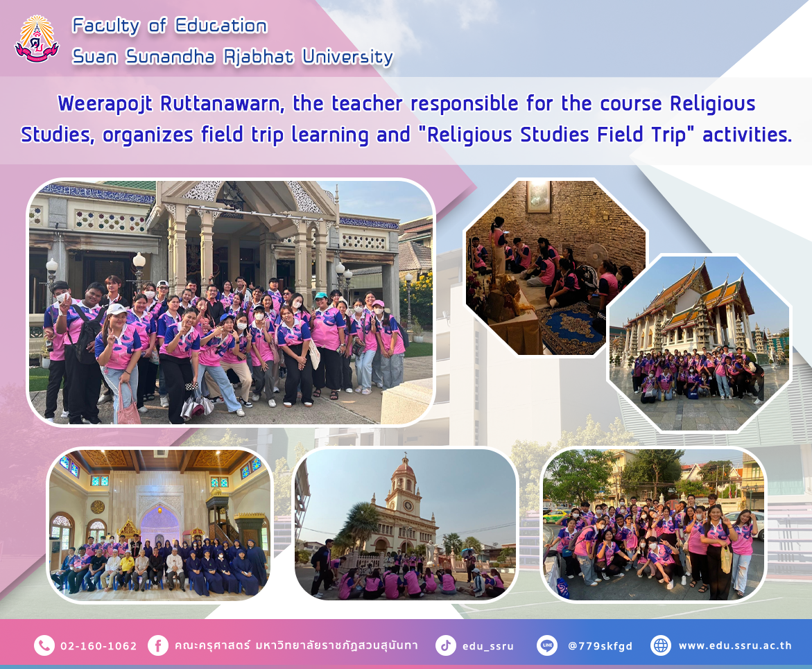 On February 12, 2024, Weerapojt Ruttanawarn, Faculty of Education, Suan Sunandha Rajabhat University The teacher responsible for the subject Religious Studies, Semester 2/2023, organized a field trip learning activity, “Religious Studies Viewpoint,” to learn about the history, background, and diversity of various religions. Through a multicultural perspective In the area of religious places in the Phra Nakhon area and Kudi Chin area, along with being honored by guest speaker Mr. Teeranun Chuangphichit, he gave a lecture to provide knowledge. For first-year students in Group 01, Social Studies major.