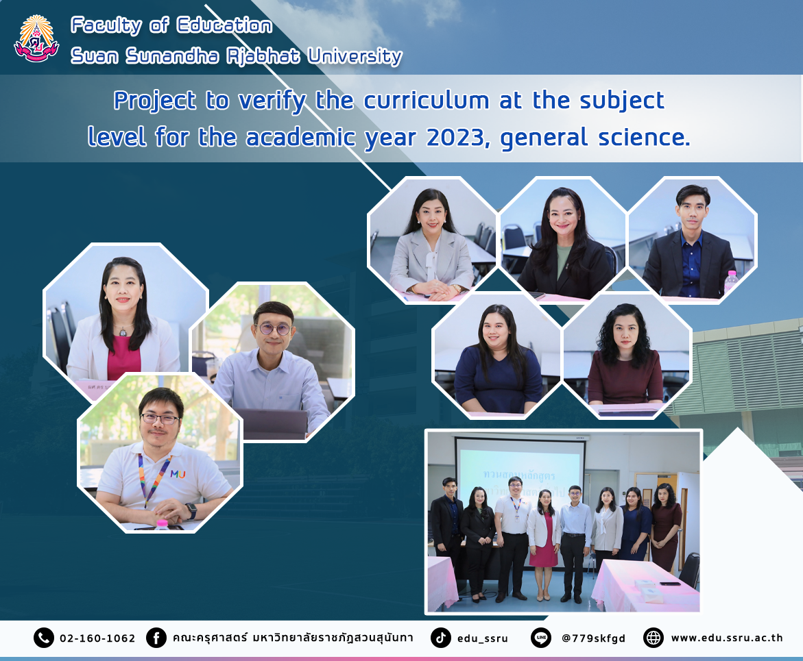 On May 14, 2024, the Faculty of Education at Suan Sunandha Rajabhat University organized a project to verify the curriculum at the subject level for the academic year 2023 in the field of general science, with Assistant Professor Dr.Boonrudee Udomphol, Associate Professor Dr. Suttipong Boonphadung, and Assistant Professor Dr. Sittiwut Charoensutthivarakul as speakers in Room 1126.