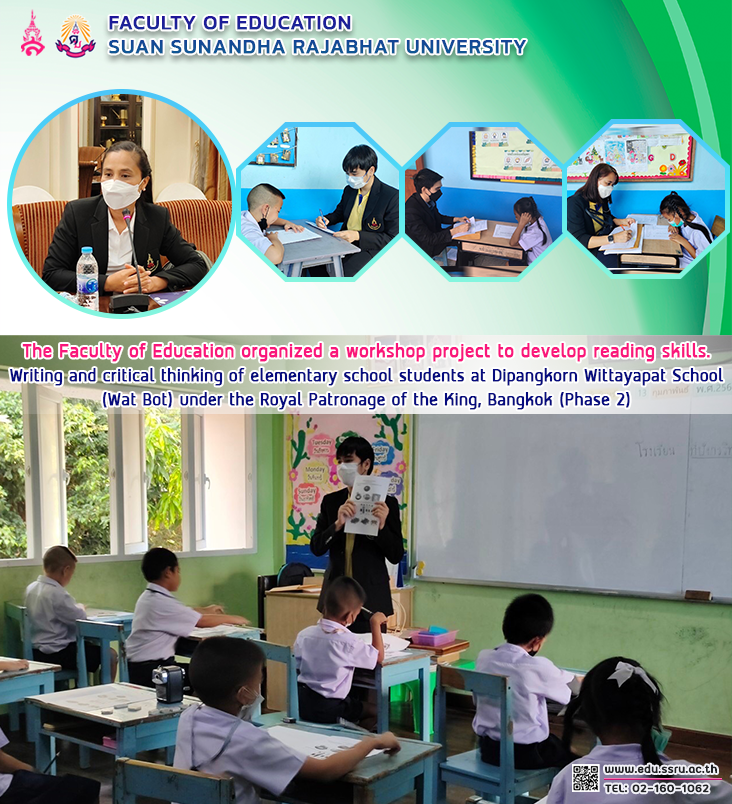 On February 13, 2023, the Faculty of Education at Suan Sunandha Rajabhat University was led by Assistant Professor Dr. Kannika Piromrat, Dean of the Faculty of Education. Assistant Professor Dr. Boonruedee Udomphon, Associate Dean for Planning and Quality Assurance, and faculty members of the Faculty of Education organize a workshop project to develop reading, writing, and critical thinking skills. of elementary school students under the OBEC in the Bangkok area (Phase 2) at Dipangkorn Wittayapat School (Wat Bot) under the Royal Patronage of His Majesty the King Bangkok