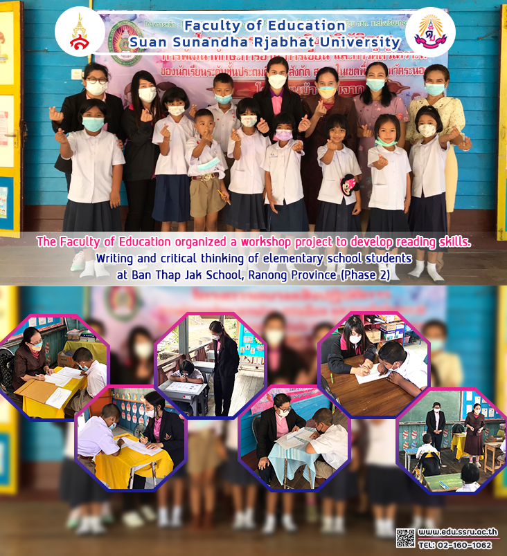 On February 14, 2023, the Faculty of Education at Suan Sunandha Rajabhat University was led by Dr. Teeraporn Plailek, Associate Dean for Research and Academic Services, and faculty members. Organize a workshop project to develop reading, writing, and critical thinking skills. of OBEC elementary school students in Ranong Province (Phase 2) at Ban Thap Chak School, Ranong Province