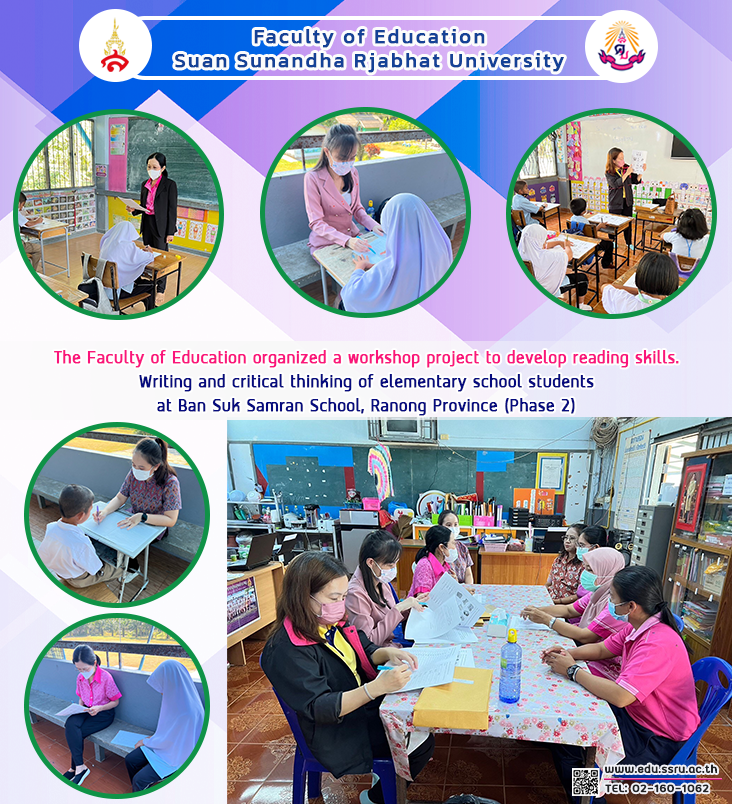 On February 14, 2023, the Faculty of Education at Suan Sunandha Rajabhat University was led by Dr. Teeraporn Plailek, Associate Dean for Research and Academic Services, and faculty members. Organize a workshop project to develop reading, writing, and critical thinking skills. of OBEC elementary school students in the area of Ranong Province (Phase 2) at Ban Suk Samran School