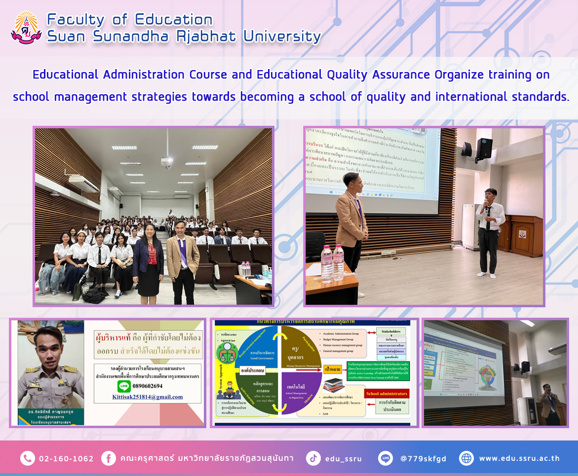 On February 14, 2024, from 1:00 to 3:00 p.m., subject: Educational Administration and Educational Quality Assurance, the Faculty of Education at Suan Sunandha Rajabhat University organized training on school management strategies towards becoming a quality school and meeting international standards. 2nd year students in the English major. and general science fields, with Assistant Professor Dr.Boonrudee Udomphol as an instructor., received honors from Dr. Kittisak Kanchanakrut, Deputy Director of Samsen Kindergarten School, who is a lecturer at Classroom 1137, Faculty of Education.