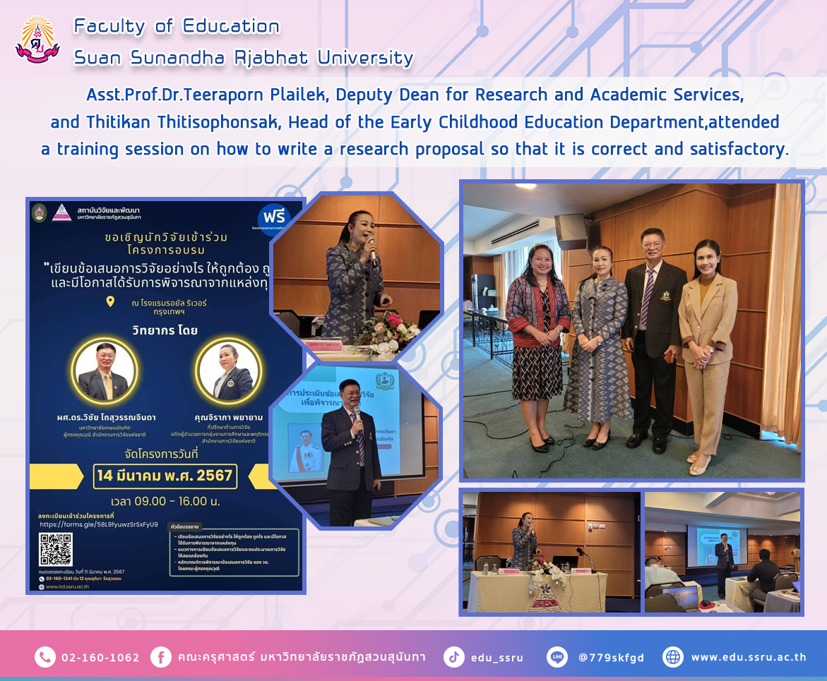On March 14, 2024, from 9:00 a.m. to 4:00 p.m., Assistant Professor Dr. Teeraporn Plailek, Deputy Dean for Research and Academic Services, and Thitikan Thitisophonsak, Head of Early Childhood Education, Faculty of Education, Suan Sunandha Rajabhat University Participate in training projects on how to write a research proposal so that it is correct, satisfactory, and has a chance of being considered by funding sources, with Assistant Professor Dr. Wichai Thosuwanchinda and Ms. Jirapa Long as lecturers at the Royal River Hotel.