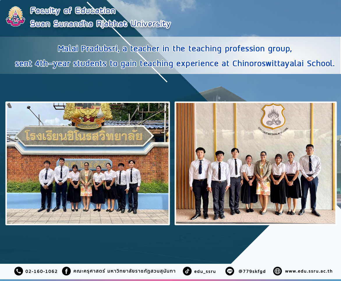 On May 14, 2024, Malai Pradubsri, a teacher in the Teacher Professional Group, Faculty of Education, Suan Sunandha Rajabhat University, sent 4th-year students to practice teaching at Chinoroswittayalai School.