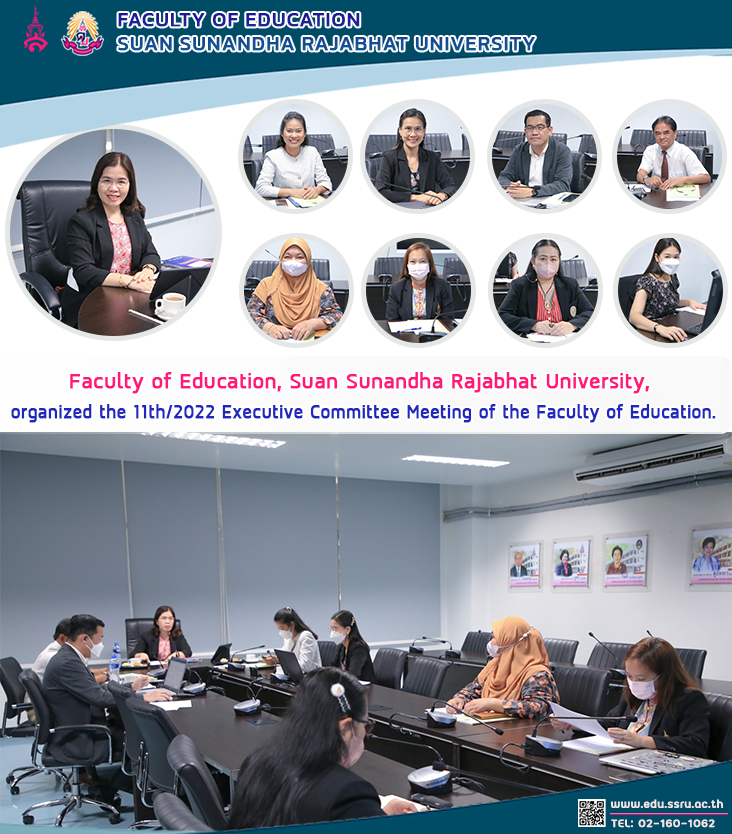 Tuesday, November 15, 2022, from 9:00 a.m. to 12:00 p.m., Faculty of Education, Suan Sunandha Rajabhat University, led by Assistant Professor Dr. Kannika Piromrat, Dean, together with all deputy deans, and Ajarn Dr. Duangkamol Chongcharoen, Director of the Center for Professional Development in Education. Assistant Professor Supanwadee Wairup, Director of the Center for Early Childhood Development, and Mrs. Rawinan Prayanoi, Head of the Office, organized the 11th/2022 Executive Committee meeting of the Faculty of Education at the meeting room 1124.