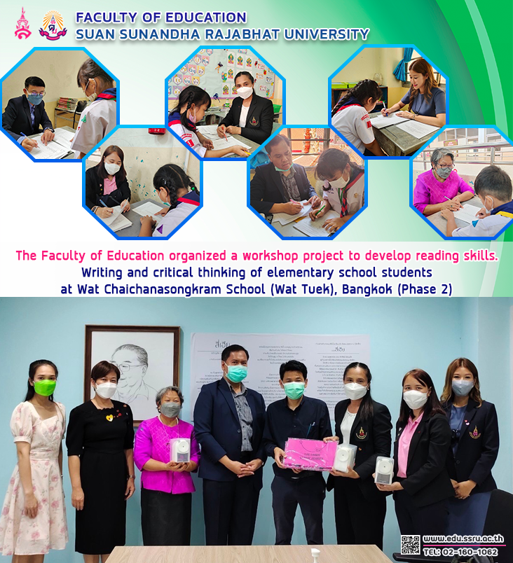 On February 14, 2023, the Faculty of Education, Suan Sunandha Rajabhat University, led by Assistant Professor Dr. Boonrudee Udomphol, Deputy Dean for Planning and Quality Assurance, along with faculty members of the Faculty of Education, will organize a workshop project to develop reading, writing, and critical thinking skills of elementary school students under the OBEC in the Bangkok area (Phase 2) at Wat Chaichana Songkhram School (Wat Tuek), Bangkok.