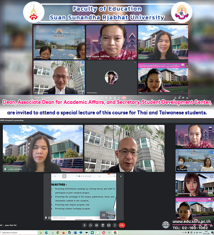 On November 16, 2022, at 9:00 a.m. Assistant Professor Dr. Kannika Piromrat, Dean of the Faculty of Education at Suan Sunandha Rajabhat University, together with Assistant Professor Dr. Tasanee Satthaphong, Deputy Dean for Academic Affairs, welcomed Dr. Kelvin Chen (Dean of International Affairs, National Pingtung University, Taiwan) and Mrs. Ya-Ping Huang in a special lecture on how to do Thai and Taiwanese Student Exchange Activities and Dr. Pintipa Suebsang, Head of the English Program, participated in the discussion. via online system Google Meet