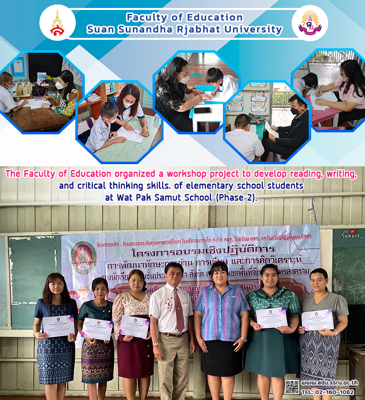 On February 15, 2023, the Faculty of Education at Suan Sunandha Rajabhat University, led by Assistant Professor Songkran Khuntiptong, Deputy Dean for Student Affairs, will organize a workshop project to develop reading, writing, and critical thinking skills. of elementary school students under the OBEC in the area of Samut Songkhram Province, Phase 2 at Wat Pak Samut School (Viyawut Chananusorn), Samut Songkhram Province