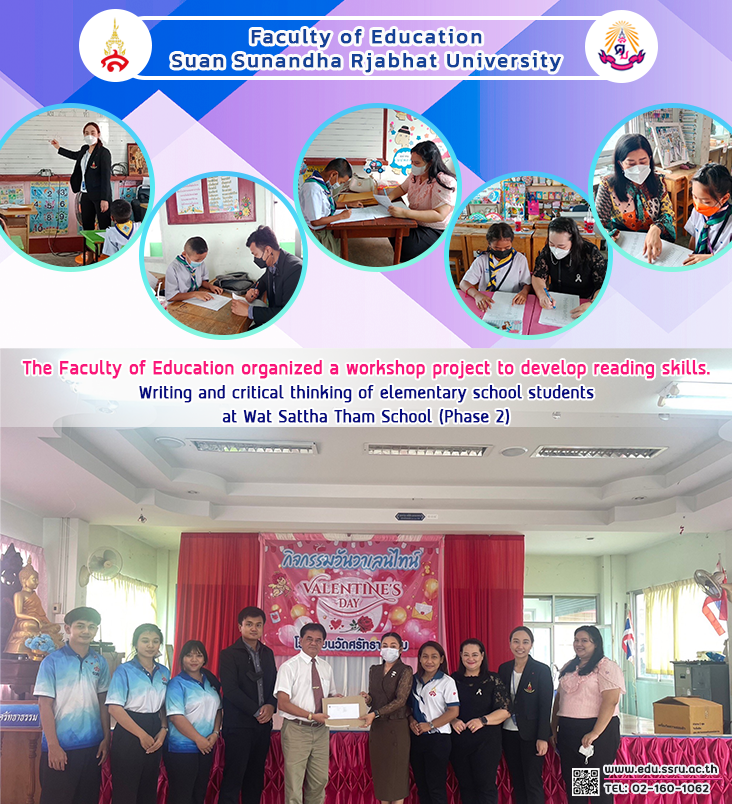On February 15, 2023, the Faculty of Education at Suan Sunandha Rajabhat University, led by Assistant Professor Songkran Khuntiptong, Deputy Dean for Student Affairs, will organize a workshop project to develop reading, writing, and critical thinking skills. of elementary school students under the OBEC in the area of Samut Songkhram Province, Phase 2 at Wat Satthatham School, Samut Songkhram Province