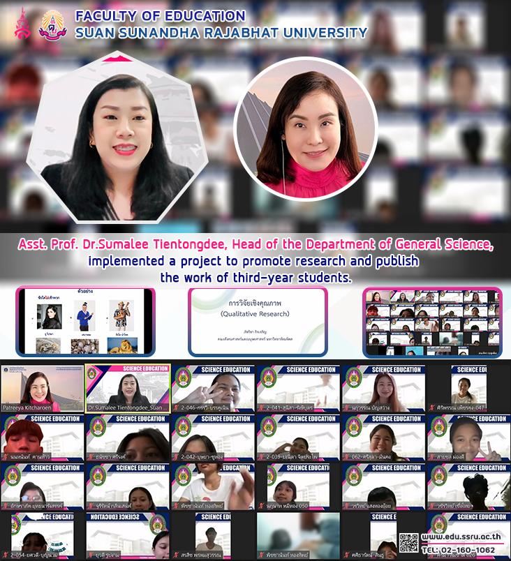 On January 17, 2023, Assistant Professor Dr. Sumalee Tientongdee, Head of the Department of General Science, Faculty of Education, Suan Sunandha Rajabhat University, implemented a project to promote research and publish the work of third-year students with honor from you. Lecturer Asst. Prof. Dr. Phatreeya Kitcharoen from Mahidol University's Faculty of Social Sciences and Humanities via online Zoom meeting