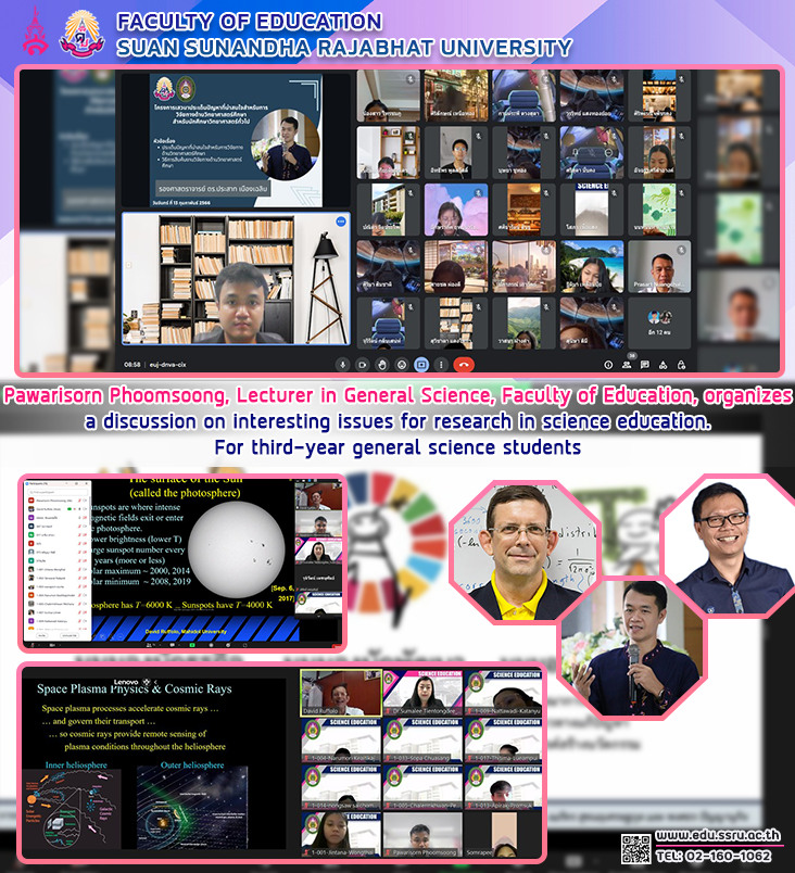 On January 16–17, 2023, and February 13, 2023, Pawarisorn Phoomsoong, Department of General Science, Faculty of Education, Suan Sunandha Rajabhat University, organized a discussion on interesting issues for research in science education. Associate Professor Dr. Chatri Fakhamta, Prof. Dr. David Ruffolo, and Associate Professor Dr. Prasat Nuengchalerm came to give a lecture and organize activities for 3rd year general science students on the topic of "The development of learning activities based on STEM education for modern science teachers." Conducting research in STEM education in the modern era Tales from the Sun: Space Physics for Science Teachers Interesting issues for research in science education and research search methods in science education via the online system