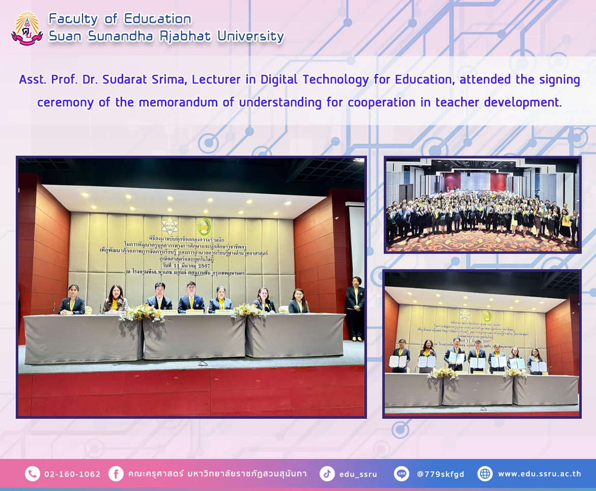On March 11, 2024, from 11:00 a.m. to 4:00 p.m., Assistant Professor Dr. Sudarat Srima, Lecturer in Digital Technology for Education, Faculty of Education, Suan Sunandha Rajabhat University, attended the signing ceremony of the Memorandum of Understanding on Cooperation in Teacher Development. Educational personnel and teaching students To develop the potential of learning management Facilitating learning in science, mathematics, and technology at the TK Palace Hotel & Convention, Bangkok