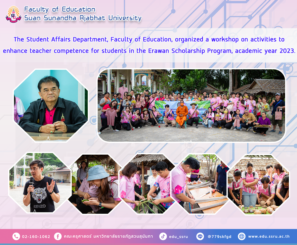 On March 16–17, 2024, the Student Affairs Department, Faculty of Education, Suan Sunandha Rajabhat University, led by Assistant Professor Songkran Khuntiptong, Deputy Dean for Student Affairs, Organize a workshop project to enhance teacher skills for students in the Erawan Scholarship Program. Leading Erawan scholarship students, years 1-4, to the learning area, workshops on kaffir lime flowers, health shells, and coconut weaving. honored by Bang Khonthi Subdistrict Administrative Organization, Samut Songkhram Province
