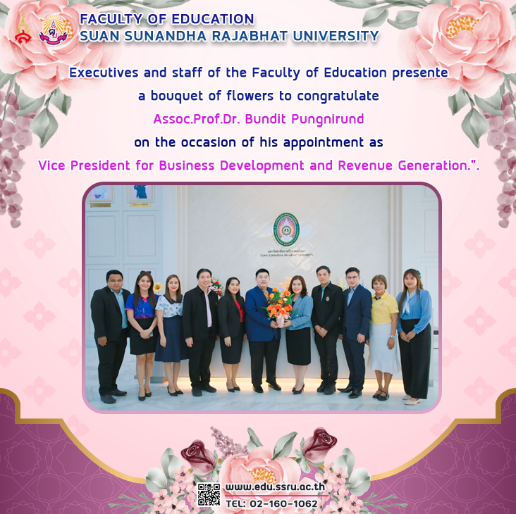 On December 18, 2024, the Faculty of Education, Suan Sunandha Rajabhat University, led by Assistant Professor Dr. Kannika Phiromrat, Dean of the Faculty of Education, along with the executives and personnel of the Faculty, presented a bouquet of flowers to congratulate Associate Professor Dr. Bundit Pungnirund on the occasion of being appointed to the position of "Vice President for Business Development and Revenue Generation.".