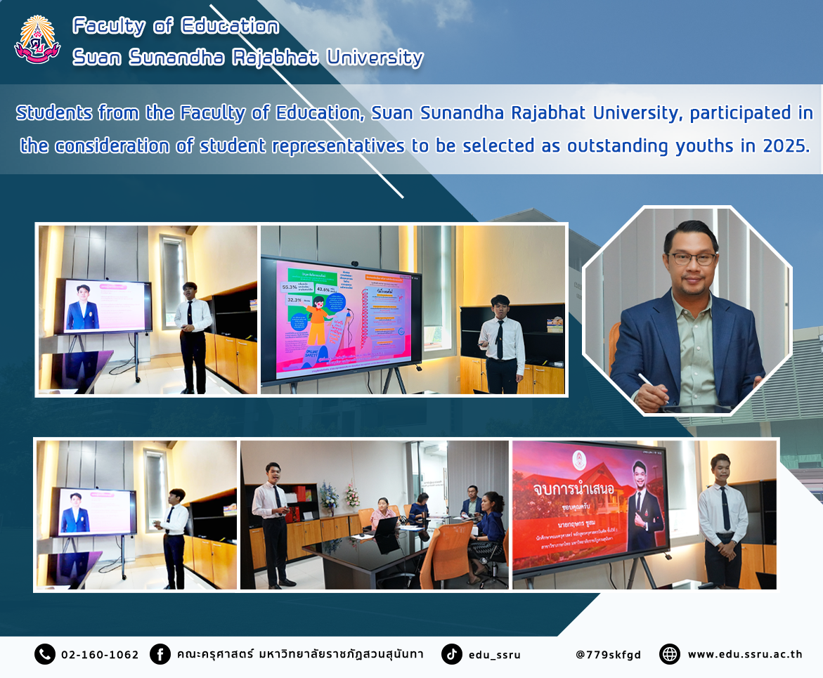 On March 18, 2025, students of the Faculty of Education, Suan Sunandha Rajabhat University, participated in the consideration of student representatives to be selected as outstanding youths in 2025, namely Mr. Muhammad Ghaifan Salae, Social Studies Program, and Mr. Kritsakorn Chusom, Thai Language Program. Mr. Muhammad Ghaifan Salae, Social Studies Program, was selected as a representative of Suan Sunandha Rajabhat University to be selected as an outstanding youth by the National Council on Social Welfare of Thailand under Royal Patronage on the occasion of National Youth Day 2025.