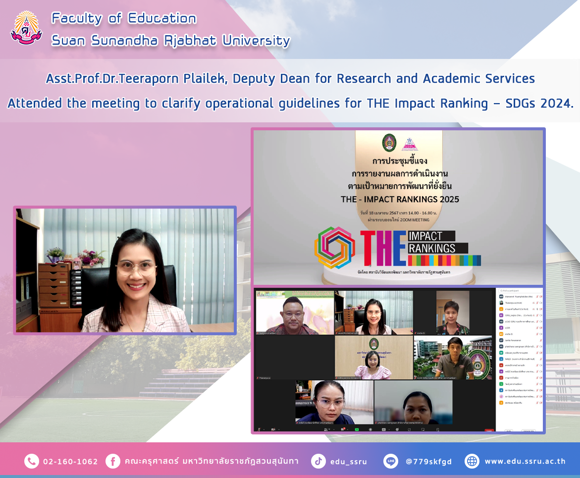 On April 18, 2024, from 2:00 p.m. - 4:00 p.m., Assistant Professor Dr. Teeraporn Plailek, Deputy Dean for Research and Academic Services, Faculty of Education, Suan Sunandha Rajabhat University Attended the meeting to clarify the operational guidelines for THE Impact Ranking – SDGs 2024 in order to drive university rankings according to the Sustainable Development Goals (THE Impact Rankings) to have performance in line with the set goals. of research and development institutes in online form