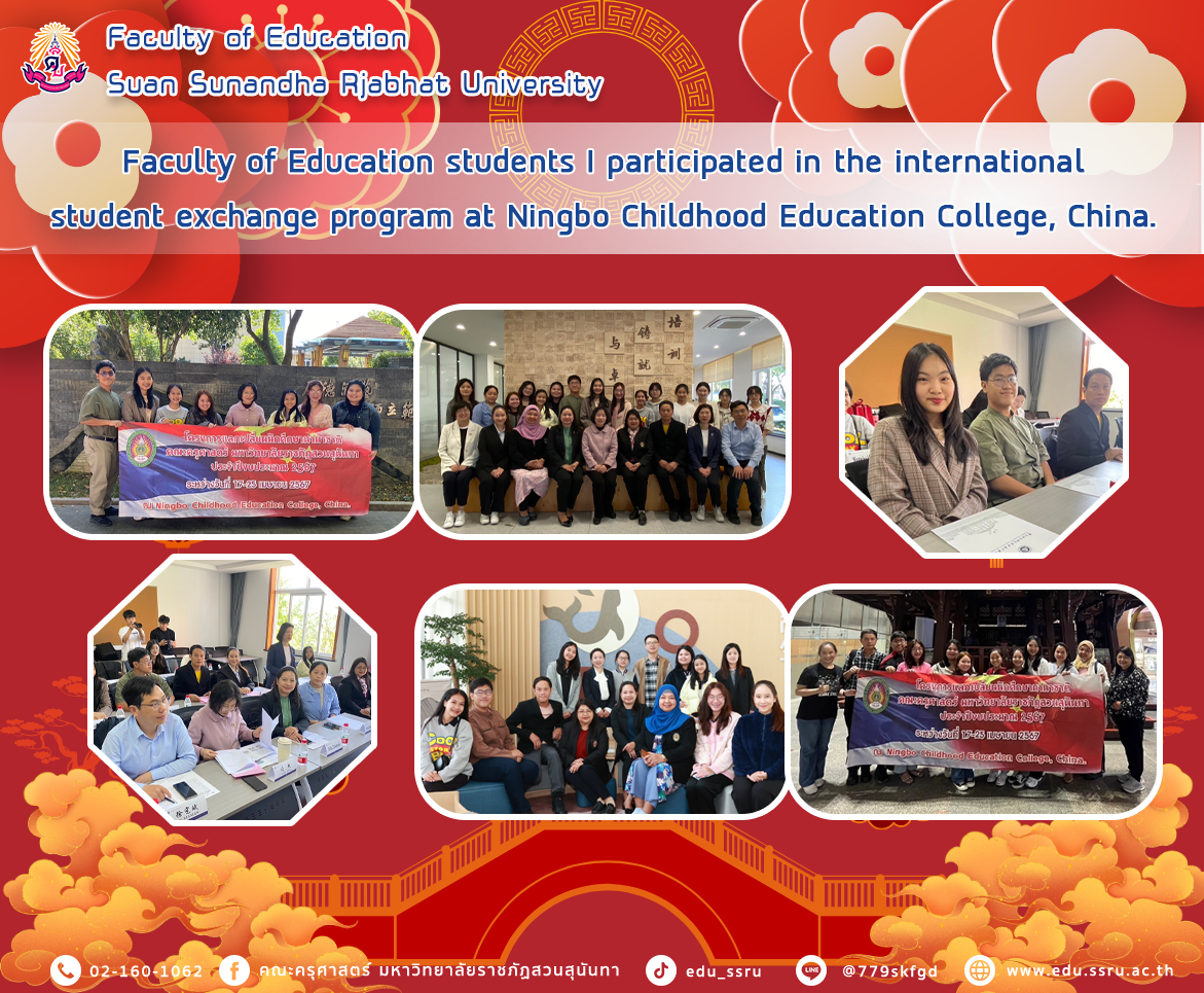 On April 17–19, 2024, faculty of education students participated in the international student exchange program at Ningbo Childhood Education College, China. There were 7 students participating in the project, including Assistant Professor Supanwadi Waiyarup, Director of the Early Childhood Development Center. Assistant Professor Panuwat Sivasakulrat, Head of the Teaching Profession Group Teacher Thitikarn Thitisoponsak, Head of the Early Childhood Education Department Assistant Professor Sirimanee Banjong, and Professor Disira Pangsanga, Lecturer in Early Childhood Education Being a student caretaker