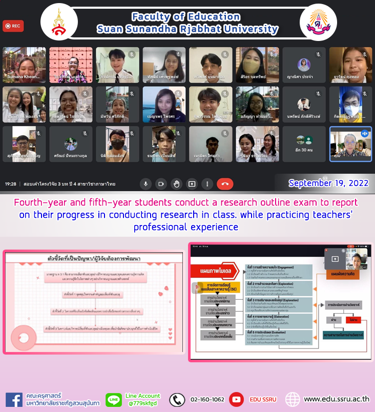 17-18 September 2022, 4th year and 5th year students in the Thai language department, Faculty of Education, Suan Sunandha Rajabhat University Conduct a research outline exam to report on progress in conducting research in the classroom. while practicing teacher professional experience according to the Bachelor of Education program The examination committees are as follows: 1) Associate Dean for Academic Affairs, Dr. Tasanee Satthaphong 2) Asst. Prof. Dr. Wipawan Eakwonnang (qualified person) 3) Sumana Kheannil (Head of the branch and professor in the Thai Department) as a committee for conducting the examination online with Google Meet