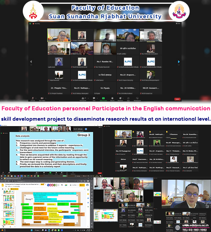 Faculty and staff from the Faculty of Education will be on campus from 08.30 to 17.00 on November 16 and 19, 2022. Suan Sunandha Rajabhat University Participate in the English communication skill development project to disseminate research results at an international level. for preparing for attending international research conferences via the Zoom Meeting online system with a team of experts, including: 1) the Assoc. Institute of Creation and Promotion of Lifelong Learning (SorSorRor). Suan Sunandha Rajabhat University