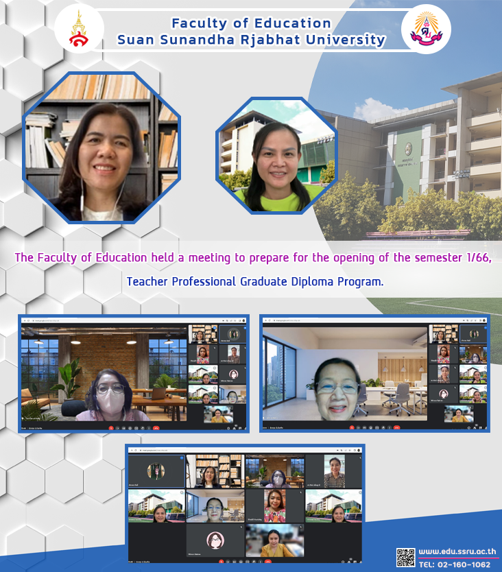 On June 19, 2023, the Faculty of Education, Suan Sunandha Rajabhat University, led by Professor Dr. Patcharaporn Pilasombat, chairman of the graduate program, Organized a meeting to prepare for the opening of semester 1/66, Teacher Professional Graduate Diploma Program, with Assistant Professor Dr. Kannika Piromrat, Dean of the Faculty of Education. presided over the meeting in the form of an online meeting.